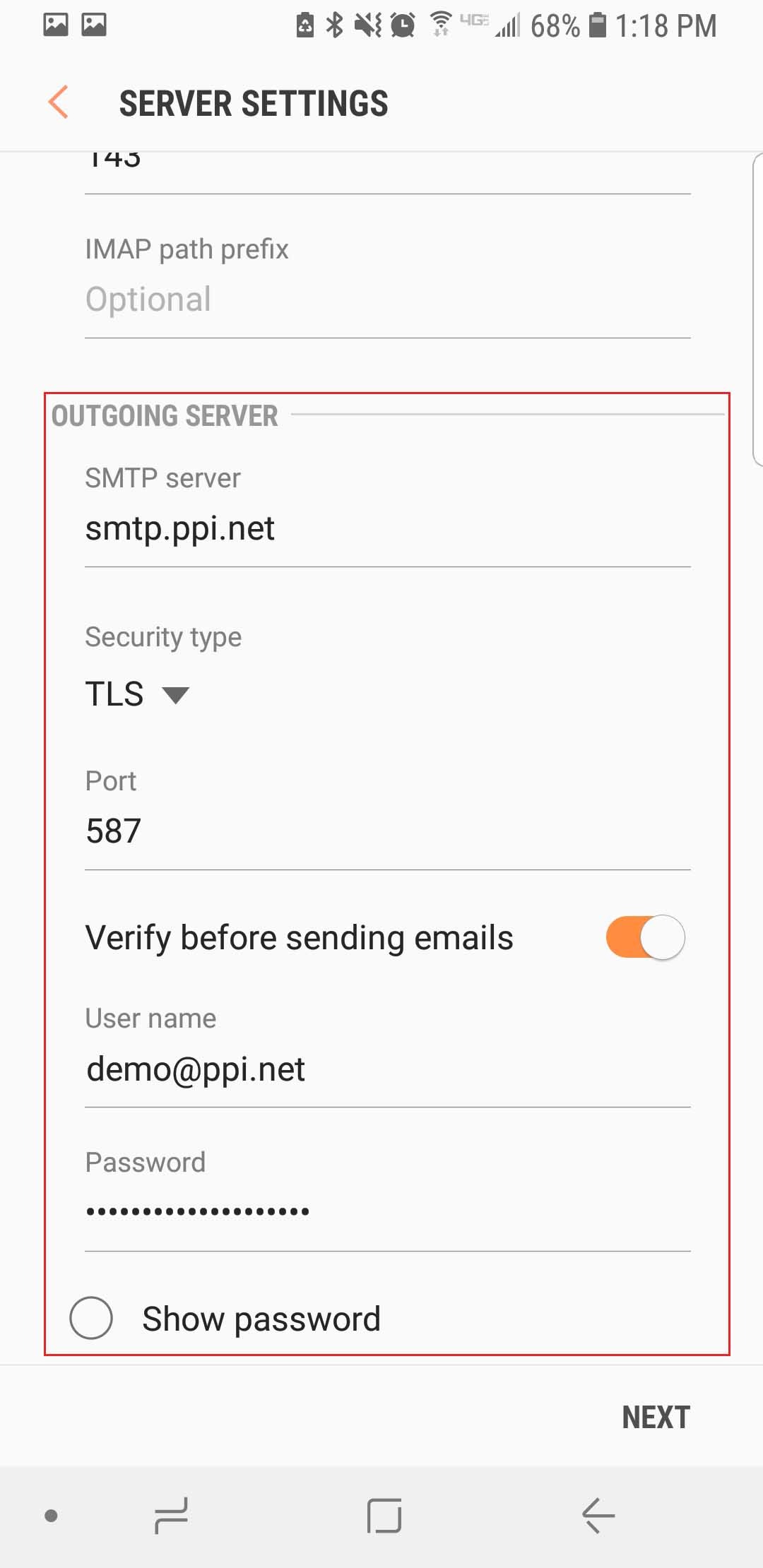 - Scroll down and under Outgoing Server make sure you have the following settings: