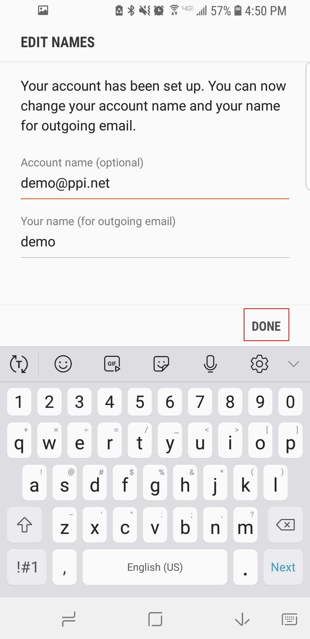 - On the Edit Names screen you can change the Account Name and Your Name to better identify your email box on your device. Tap Done to complete set-up.